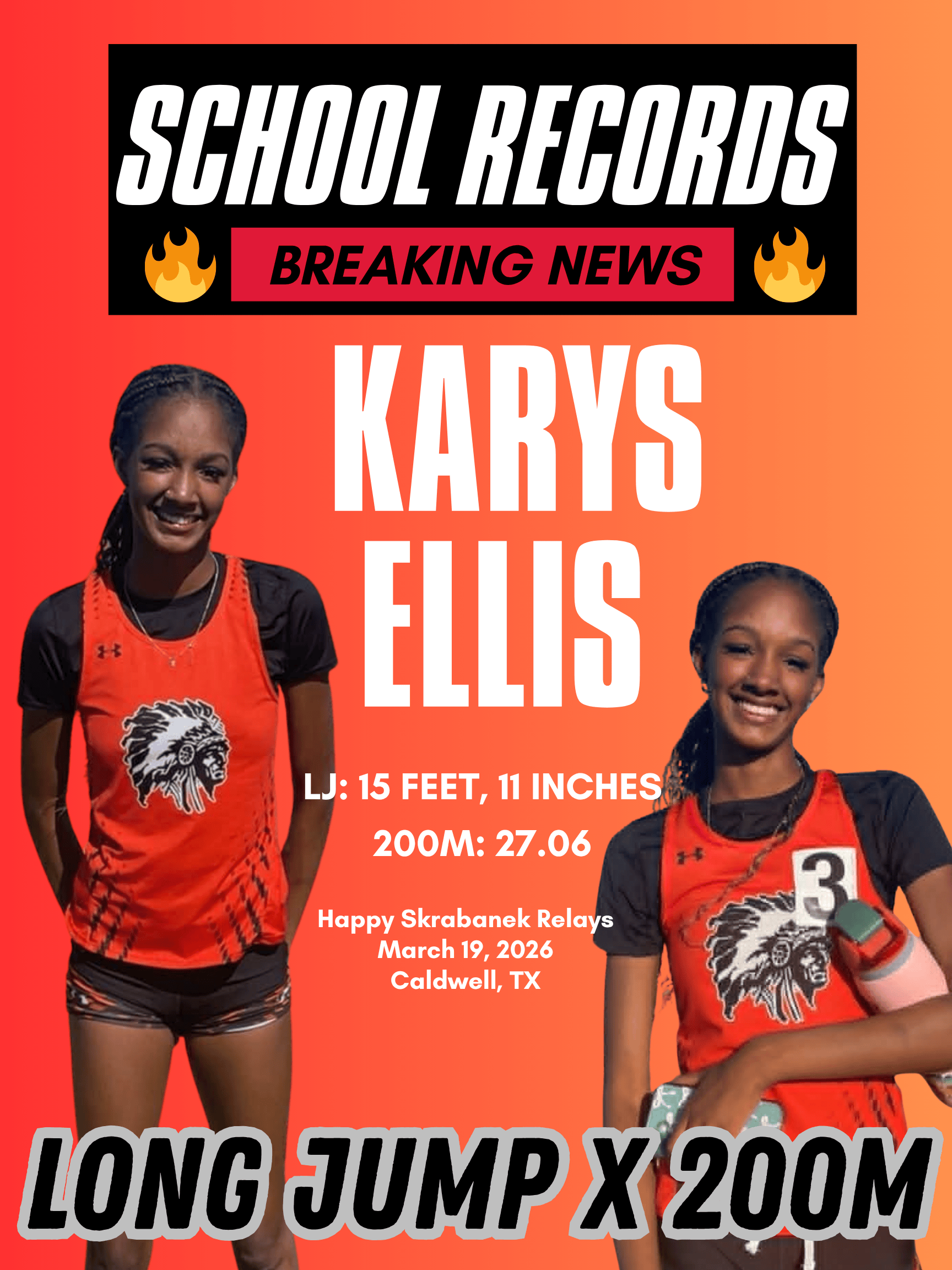 Congratulations to Karys (KK) Ellis, who set two new school marks at the Happy Skrabanek Relays in Caldwell. She soared 15 feet, 11 inches in the girls long jump, and it followed up with a 27.06 time in the 200m dash! |
